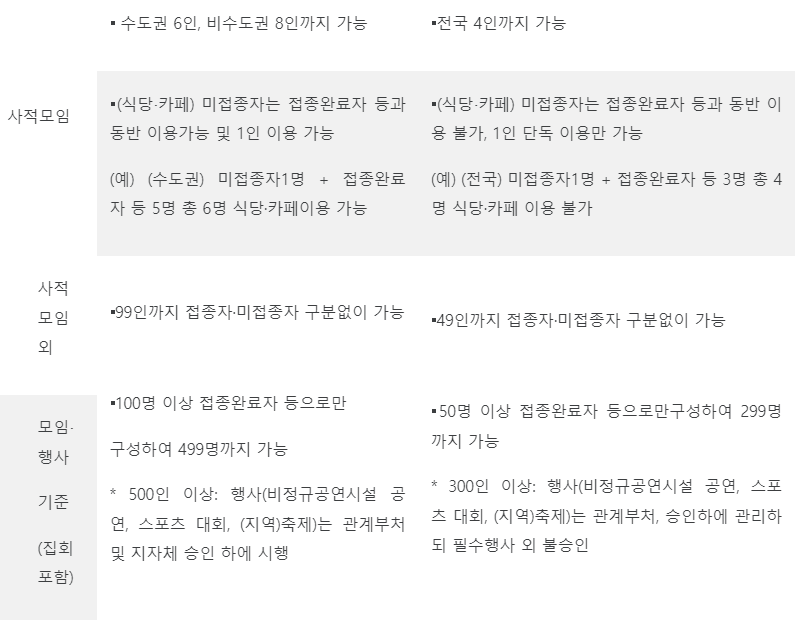 기존에 미접종자가 포함될 때는 99명까지, 접종 완료자만으로는 499명까지 모일 수 있던 행사 인원 기준이 미접종자 포함 49명, 접종완료자만으로는 299명까지로 줄어듭니다.